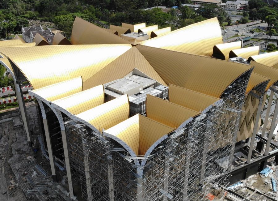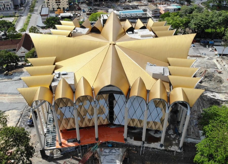 The gold colour was chosen for the roof and facade cladding as this resonates with the arch-ornamented Sarawak State Legislative Assembly (DUN) building. Glass panels were also installed for natural light to flow in.